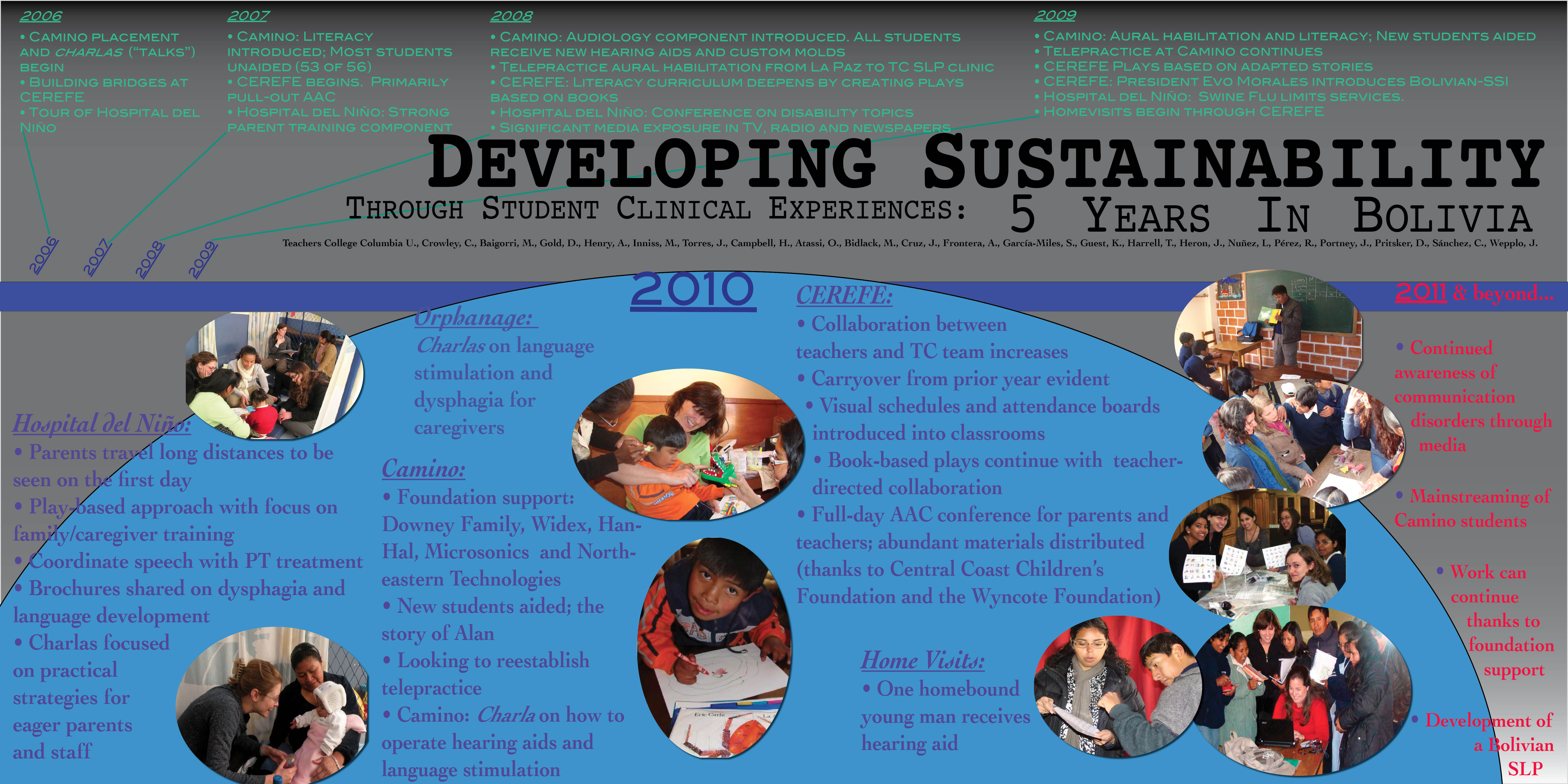 Crowley, C., Baigorri, M., Gold, D., Henry, A., Inniss, M., Torres, J., Campbell, H., et al. (November 19, 2010). Developing sustainability through student clinical experiences: five years in Bolivia. Poster presented at the American Speech-Language-Hearing Association Convention, Philadelphia, PA.